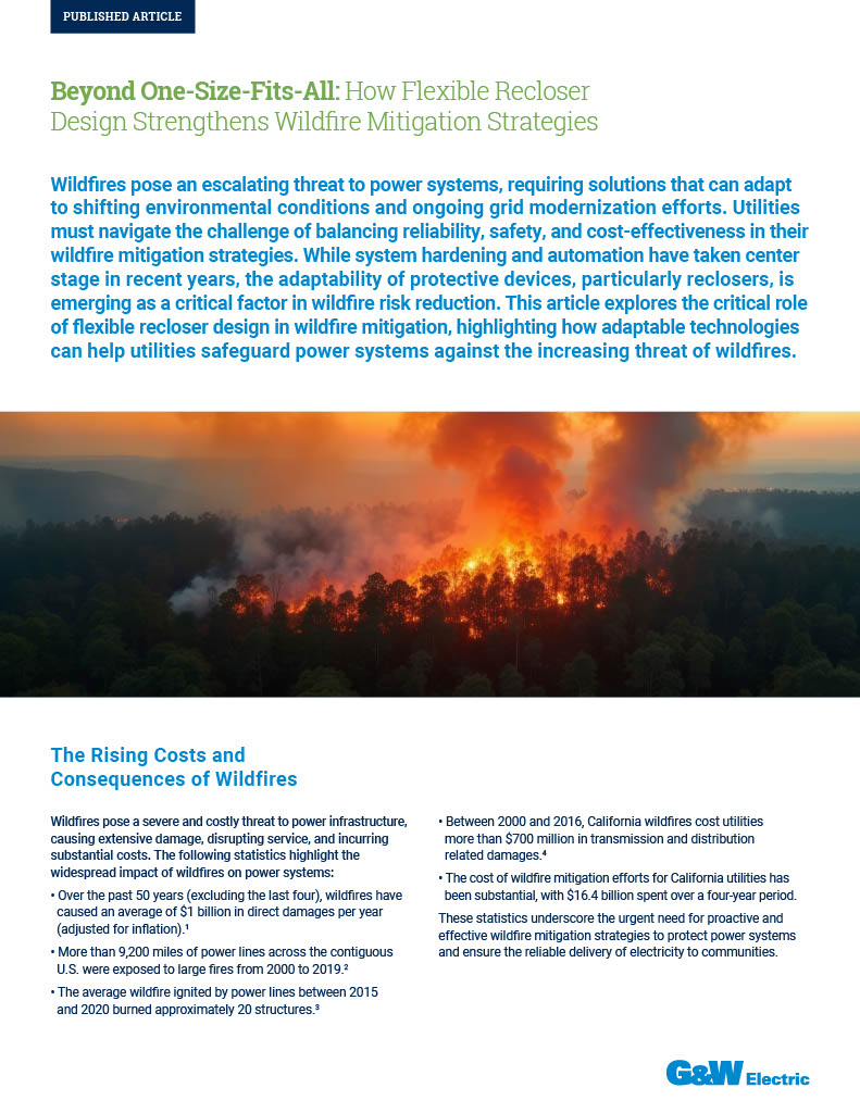 While various manufacturers offer reclosers with advanced features, G&W Electric’s Viper®-ST recloser stands out as a prime example of design flexibility in wildfire mitigation. Its adaptability makes it suitable for diverse grid environments and evolving wildfire conditions.